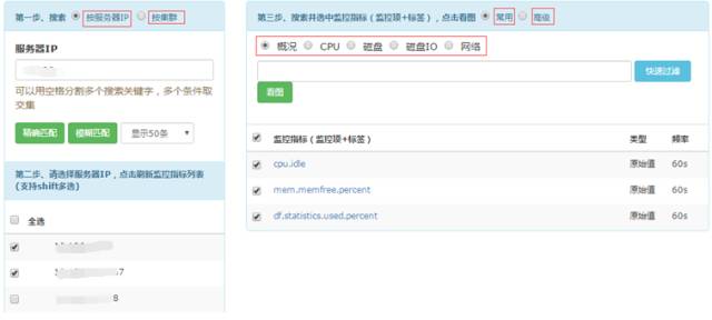 用户能够按照服务器和集群查看监控指标,为了便于用户使用,可以直接查询最常用的监控指标。