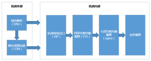 如上图所示,是相关的架构,这部分大家都比较熟悉,我们就不展开了。下面详细说一下大型网站在机房外部和机房内部的流量接入端的架构。