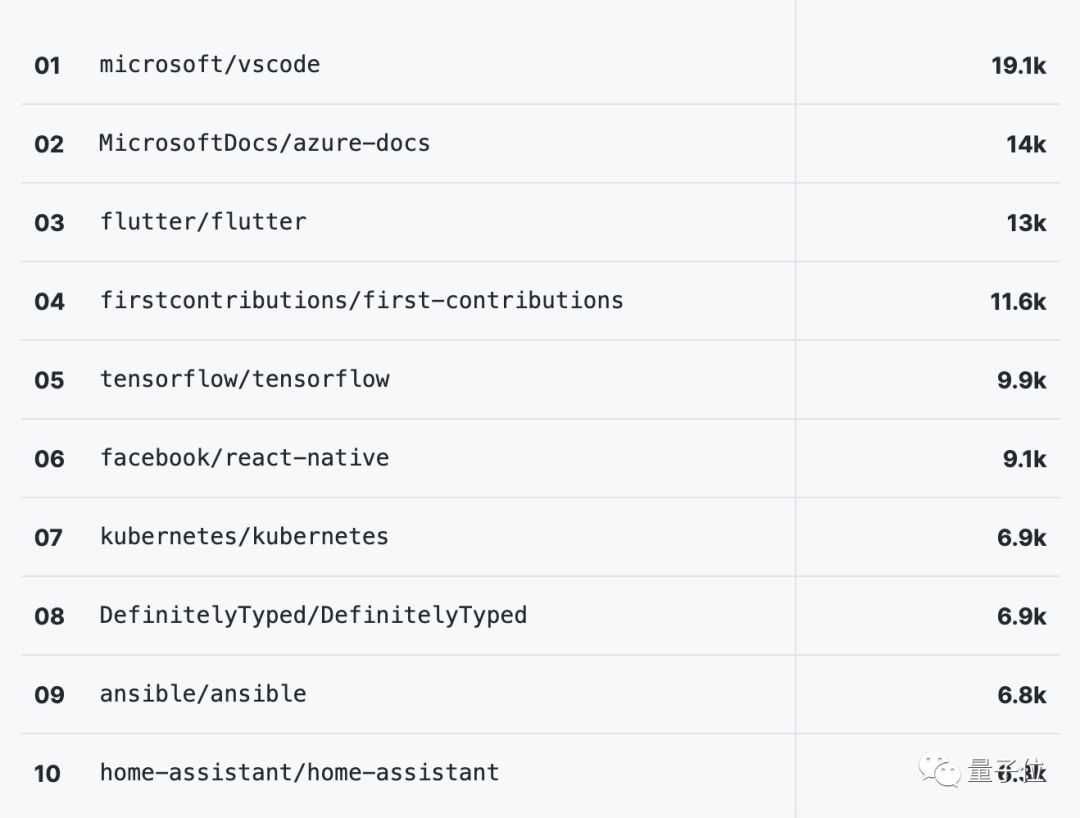 贡献最多的开源项目来自微软的VS Code (19.1K)、Azure Docs (14K)和Flutter (13K)。