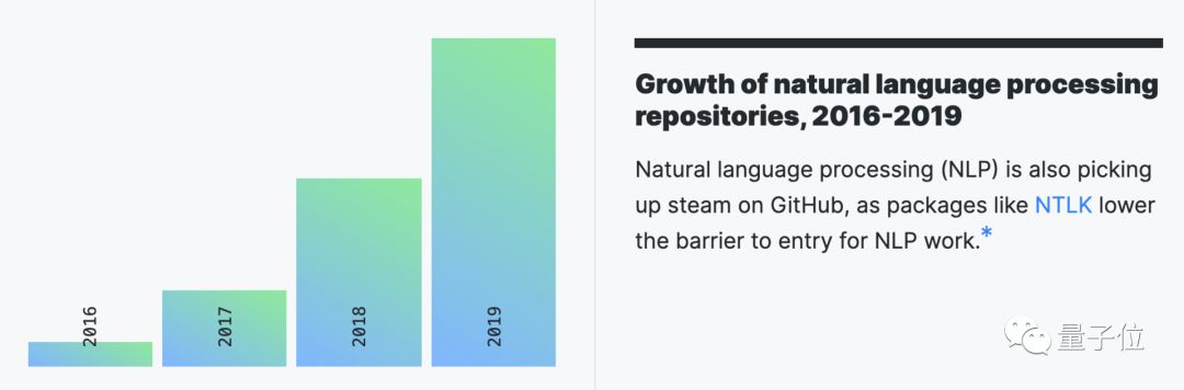 报告还发现,以“深度学习”、“自然语言处理”和“机器学习”为主题的repo在过去的一年中越发受欢迎。