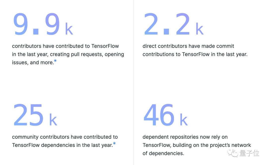 作为GitHub上最受欢迎的项目之一,TensorFlow已经建立了一个庞大的软件社区。去年有9900人为TensorFlow做出了贡献,有4.6万个项目依赖于TensorFlow。
