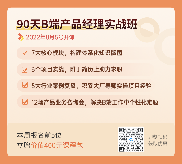推荐你来《90天B端产品经理实战班》提升,多位10年+经验大厂实战导师在线直播,带你掌握系统的B端产品工作方法,助你顺利转岗&提升专业能力。