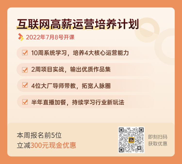 今天给大家推荐《互联网高薪运营培养计划》,用10周时间,从0-1,补齐各个模块的能力,搭建起运营系统知识体系,为升职加薪做好充足准备!