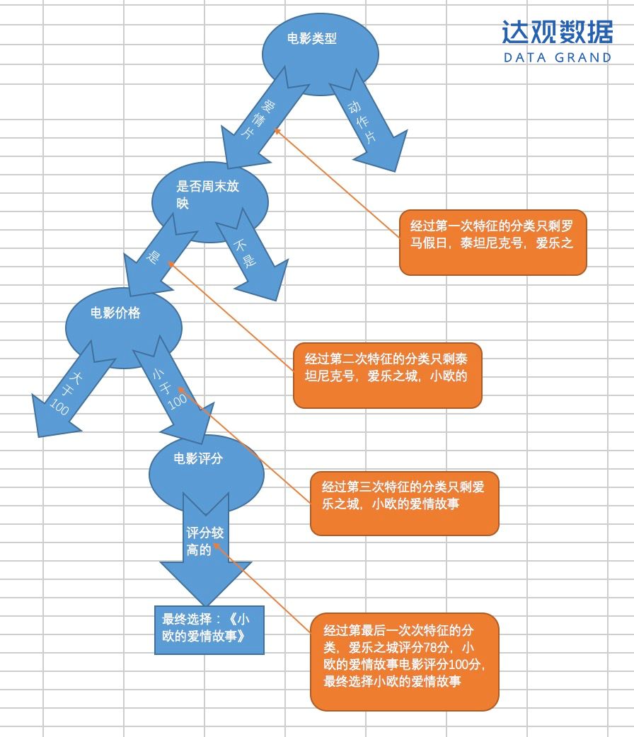假如我们觉得最终得到的这部电影是我们想看的,那么我们的判定流程就是对的,也就是说这个决策树的生成。