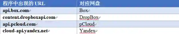 该后门程序使用公共云盘进行数据中转,程序中内置了4种云盘,分别是box,dropbox,pcloud, yandex,此次截获的样本使用的为pcloud网盘。