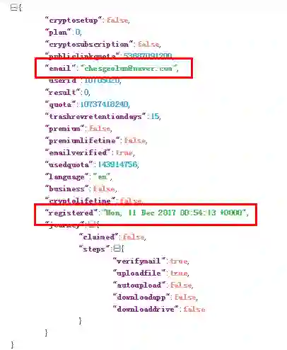 通过对程序的逆向分析,我们发现了网盘的Token权限并没有被严格限制,通过该Token可以获得网盘的注册信息和保存在网盘中的内容,从中我们定位到了攻击者的网盘注册邮箱为cheseolum@naver.com,注册时间为2017年12月11日,与韩国响应中心公告的11月开始攻击的时间相近。