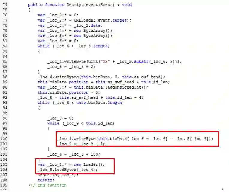 诱饵文档中的flash将解密远程URL地址返回的加密文件流,动态执行包含cve-2018-4878漏洞的flash内容。