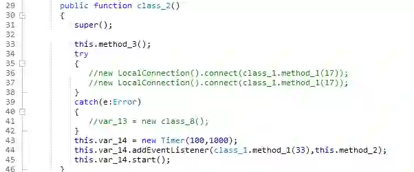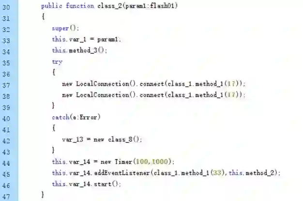 在class_2的构造函数中 LocalConnection().connect会主动调用gc释放没有的引用的内存,而第二次的LocalConnection().connect调用会产生异常,异常处理过程中又会new一个class_8的对象赋值给var_13。
