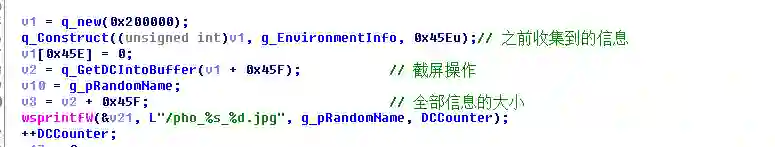 程序通过GDI API来实现截取受害机器屏幕的功能,并将图片保存在temp目录下,命名方式为随机产生的表示序号+当前截图的序号