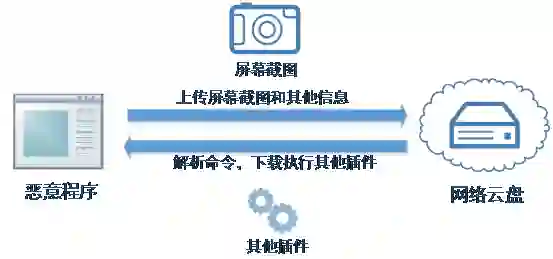 该程序使用公共网盘作为C&C服务器,用来存储截屏信息或者进行插件下载;相对于传统的CC服务器,使用公共网盘提高了流量识别的难度,因为网盘类网址均为可信的白域名。