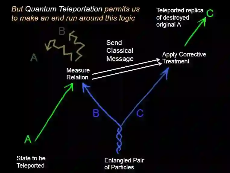 通过量子隐形传态,我们可以在接收端重建出与原来的粒子拥有全部相同的量子特性的粒子,即使我们并不能同时测量这些量子特性然后通过经典方式发送相关信息。