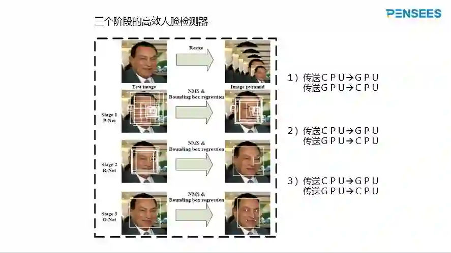 三个阶段的高效人脸检测器运行速度快,分类效果不错。然而,如果CPU跟GPU联合使用的话,CPU与GPU之间的传输数据时间不可忽略,如下图所示。