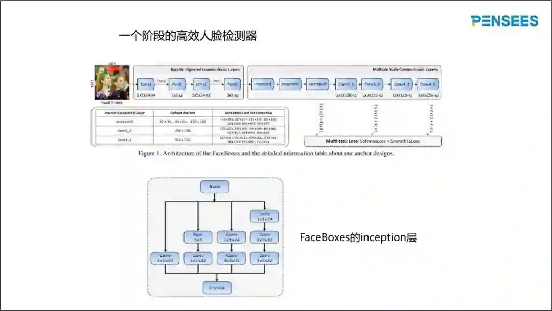 为了减少传输数据的时间,我们寻找一个阶段的人脸检测器,即只有一个深度模型的人脸检测器。下面我们来看一下一个阶段的高效人脸检测器。因为没有快速预淘汰简单负样本的步骤了,我们在前两个卷积层和欠采样层大大降低网络输入图的尺寸,缩小率为32倍。两个卷积层之后还有非常多的深度学习层,但是因图像尺寸非常小了,其计算量并不大了。一个阶段的人脸检测器没有图像金字塔了,但是有一个以上的分类输出层。输出层的输入是不同尺寸的特征图,一个阶段的人脸检测器基于特征金字塔,是克服人脸大小未知的另外一种方法。两个尺度之间跨度比较大,容易漏检特征金字塔中间大小的人脸。为了避免这种现象,设计了Inception模块。其设计特点为不同分支,分支卷积核大小不一致,最终连和不同分支。不同卷积核大小的分支构造不同大小的感受野,构造不同尺度的特征图。连续三次使用Inception模块,构造非常多的卷积核大小的组合,非常好地客服了人脸大小未知的问题。