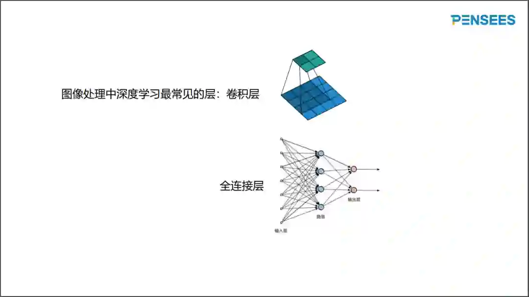 人脸识别属于图像处理的领域。图像处理领域中最常见的层是卷积层,比较一下卷积层和全连接层。如下图所示,全连接层每个输入节点跟任何输出节点都构造一个连接,而卷积层只有考虑特殊的连接。一个卷积核扫描所有输入图的窗口,可以做到参数共享、参数数量降低。可训练参越多,越容易发生过度适应现象,因卷积层大大降低了参数数量,其过度拟合现象大量减少,卷积操作可以理解为深度学习网络的正则化。另外全连接不考虑二维图像拓扑,而卷积层更好地利用相邻像素之间的关联性。