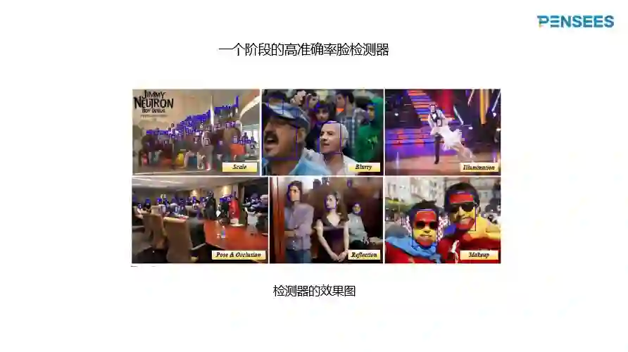 如下图所示,准确率高的人脸检测器对不良因素的鲁棒性非常强,可以检测出尺寸更小的人脸、模糊人脸、光照情况复杂、曝光、很暗的人脸、被局部遮挡的人脸,还有反光、姿态奇特或者化妆的人脸。抓拍系统不会使用计算量庞大的高准确率人类检测器,而调用上述提到的快速人脸检测器。当然,对不利情况下的检测率有一些折扣。假设,远处的人脸尺寸小、非常模糊,快速人脸检测器漏检了。但是十几帧之后人移动到离摄像头更近的位置,不显得那么小和模糊,检测出的概率大大提高。以人为单位的快速人脸检测器的检测率可以超过99%。