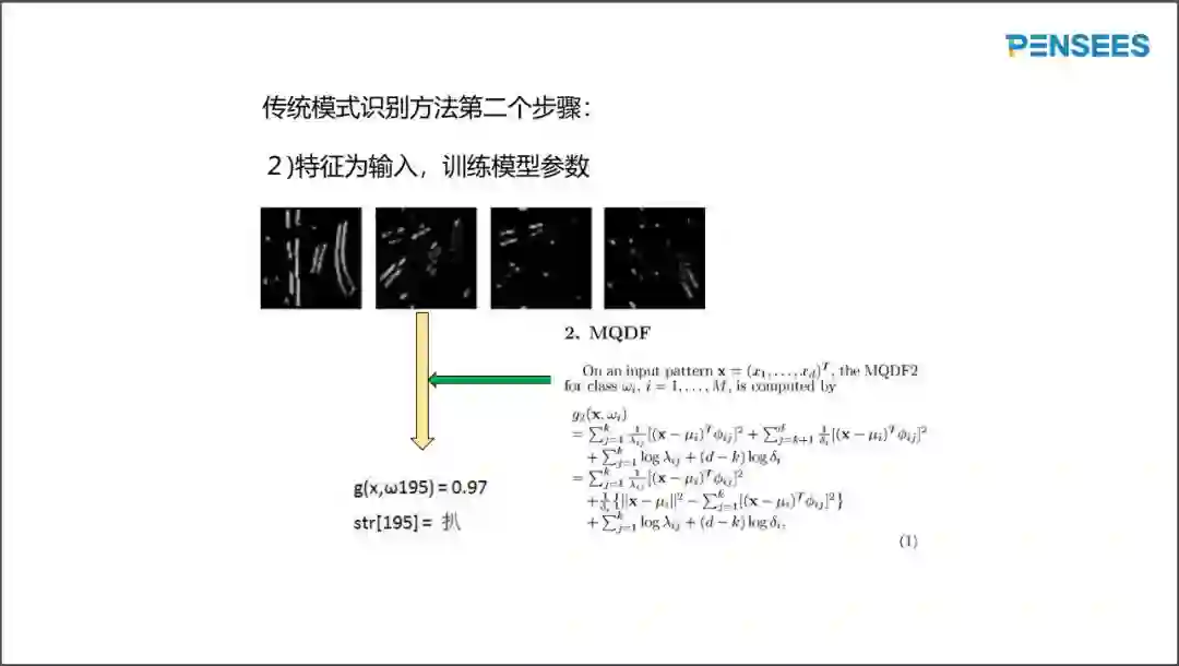 传统算法第二步为“训练参数”,参数训练是基于在第一步提取好的特征进行的。下图显示对于文字特征向量的建模,每类由多维高斯分布建模。多维高斯分布唯一由期望值和相关矩阵描述。为了提高鲁棒性,仅仅估计了相关矩阵的前k个特征值和特征向量,后(d-k)个特征值由一个常数描述。有了每一类的参数,可以使用贝叶斯分类器对未知、不在训练库的新图像提取特征,并对提取好的特征进行分类。