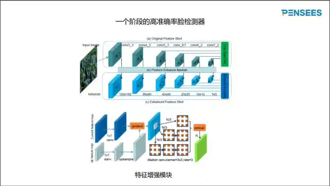 下图中显示的人脸检测器不关注运行速度,但争取更高的准确率。代价是几百倍的计算量,我们这关注的是网络架构。高准确率人脸检测器也属于一个阶段的检测器,基于特征金字塔,总共有六个尺寸层次。与以前的模型相比,特征金字塔不直接当成网络输出层的输入,但是还加上特征增强模块。特征增强模块考虑到两个相邻的特征图,对尺寸小的特征图进行上采样,构造跟尺寸大的特征图同样的尺寸。用乘法融合两个相邻的特征图,再加上基于inception思想的模块,这才是分类输出层的输入。