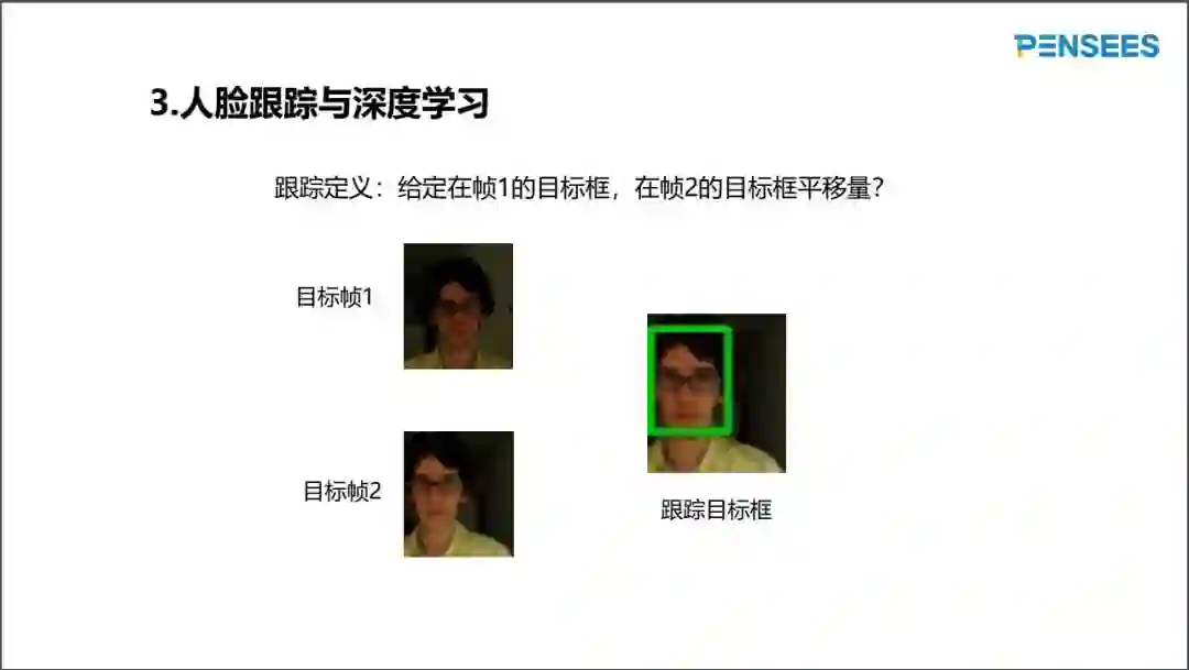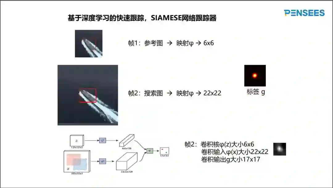 虽然基于相关滤波的跟踪算法在CPU上非常快,但是利用不起来GPU并行计算资源,因为快速傅里叶变换由很多零散的计算步骤组成,其GPU并行计算加速效果很差。接下来,给大家分享基于深度学习的跟踪算法,可以充分利用GPU并行计算资源。下图显示SIAMESE网络的跟踪器的流程。在帧1以目标位置为中心稍微扩充,构造参考图,用深度学习映射phi构造尺寸非常小的特征图(6x6)。在帧2扩充范围更大,构造搜索图,用同样的映射phi计算出尺寸比较大的特征图(22x22)。SIAMESE网络的特点是其输出层,所谓的相关层。6x6的特征图当作卷积核,扫描22x22的特征图,构造17x17大小的输出图。跟踪的效果就是输出图最大值的对应的位置。因17x17尺寸比较粗糙,经常对输出图进行上采样操作,获取更大分辨率的跟踪效果。SIAMESE网络属于离线学习的跟踪器,因为映射phi与原始图像无关,需要大量的人脸训练样本在GPU上学习映射phi的参数。然而,上述介绍的相关滤波跟踪器是在线学习的跟踪器,模板H依赖于原始图像,关键在于模板H的训练过程极快。