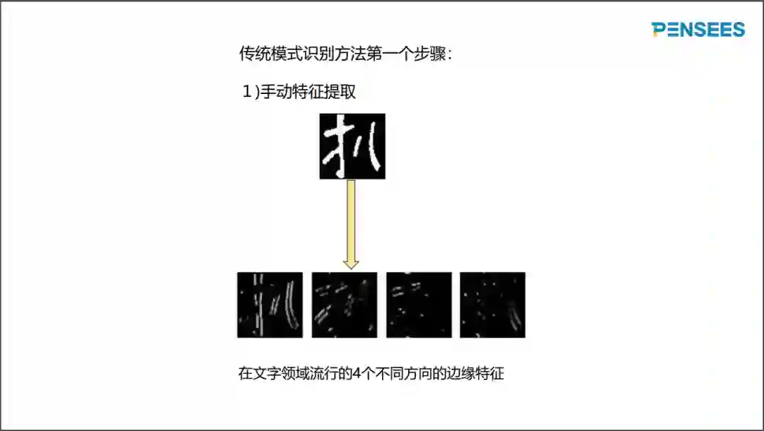 传统算法主要有两个步骤。其中第一步为“手动特征提取”,即按照当前分类任务手动定义特征提取方法。下图显示对于文字图像的边缘特征,总共四个方向的边缘特征。深度学习之前,基于四个方向的边缘特征在文字识别领域非常流行,因为文字图像边缘特征的判别能力好于原始图像像素的判别能力。