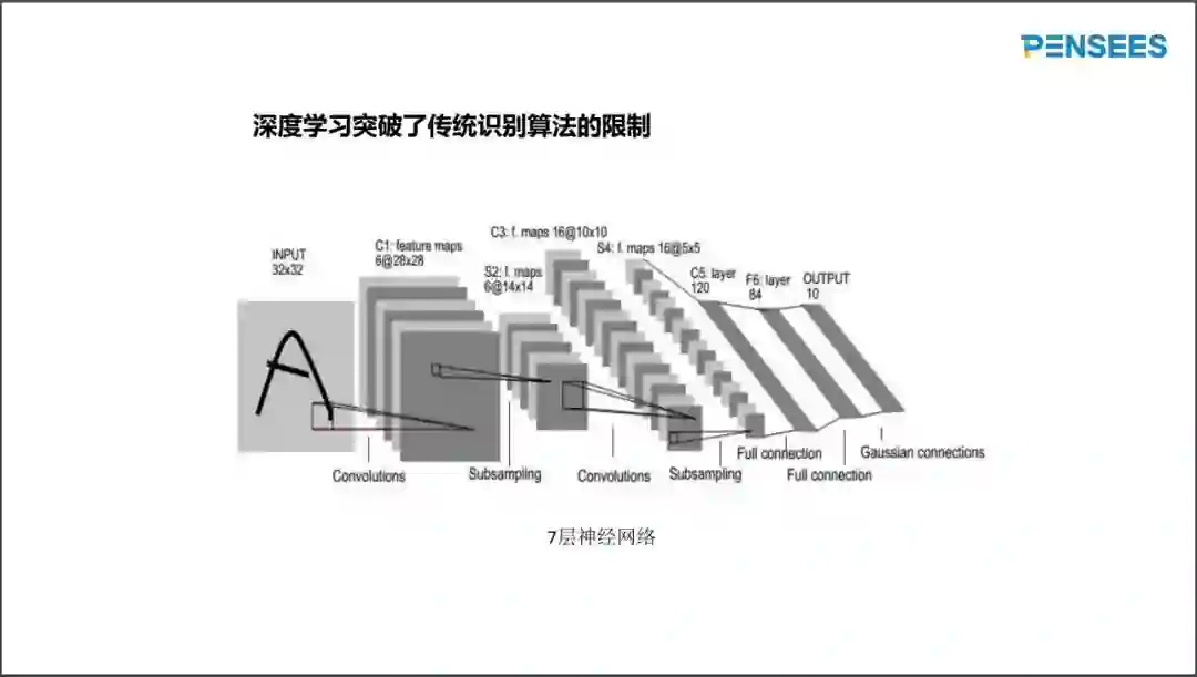 来看一下深度学习早期的一个完整的深度学习网络模型。下图显示所谓LENET5的拓扑:卷积层1、欠采样层2、卷积层3、欠采样层4、卷积层5、全连接6、分类输出层7。LENET5对32x32大小的输入通过卷积和欠采样和全连接层提取84维的特征向量,对84维的特征向量进行最终的分类,都在一个联合框架中。