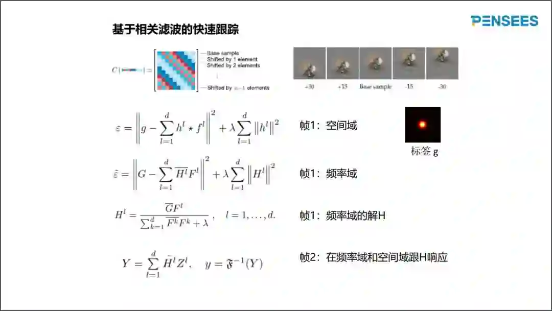 接下来,给大家分享一下一个属于传统算法领域的跟踪算法。其特点是运行速度非常快,数学模型和求解非常潇洒。下图的第一个数学公式是空间域中的数学模型,优化对象是相关核h,使得对在帧1的图像数据f进行滤波的话,得到跟标签g尽可能接近的值,其中*代表循环卷积。标签g经常选择为高斯函数。正则化系数lambda控制过度适应现象。利用傅里叶变换和相应的一些数学定理,可以把空间域建模问题等价地描述在频率域。大写字母符号代表小写字母符号的傅里叶变换。卷积定理把耗时的循环卷积操作改成快速的乘法。频率域的解析式形式很简单,只有乘法、加法和除法的操作。在帧2,对空间域的图像数据z应用傅里叶变换,跟在帧1学到的模板H进行乘法,得到频率域的响应Y,再用逆傅里叶变换回到空间域,得到空间域的响应y。最终跟踪效果为响应y最大值的对应的位置。