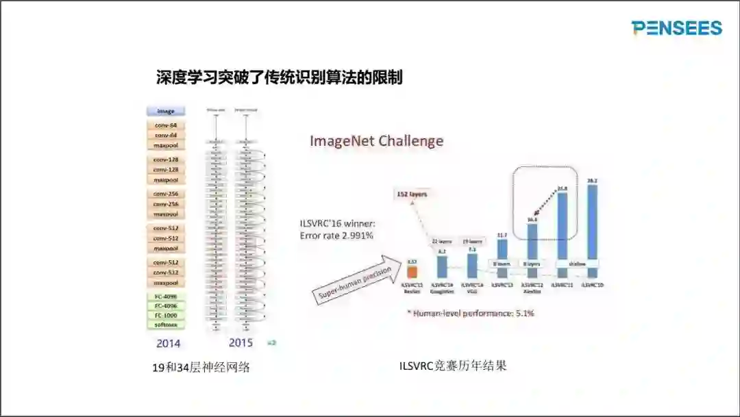 我们还需要知道的一点是,与传统算法相比,深度学习有一定的优势。在包含1000类的IMAGENET数据库中,基于几层深度学习的分类错误率为25%。将层数提高到19,错误率降低到7%,22层的错误率为6%,如果是非常深的深度学习模型(152层),错误率才3%,而人类的错误率也有5%。这说明在特定情况下,深度学习的识别率高于人类的识别率,这就引起了各行业都想将深度学习的思路融入到他们的领域里,人脸识别也不例外。