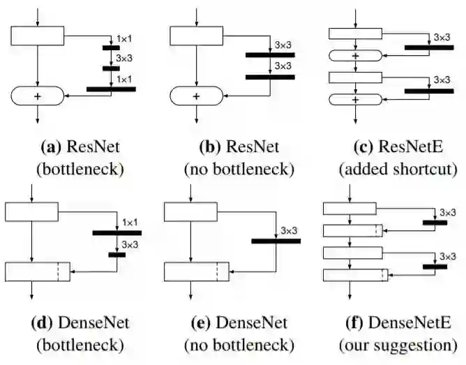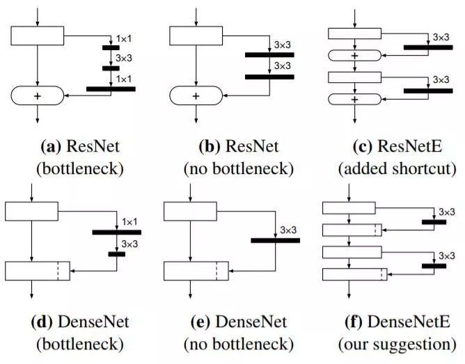 图 2:不同网络架构的单个构造块(加粗黑线的长度代表滤波器数量)。(a)带有瓶颈层架构的初始 ResNet 设计。少量滤波器会降低 BNN 的信息量。(b)无瓶颈层架构的 ResNet 设计。滤波器数量增加,但这时卷积层由 3 变为 2。(c)添加额外快捷连接的 ResNet 架构 [15]。(d)初始 DenseNet 设计,第二层卷积操作中出现瓶颈层。(e)无瓶颈层架构的 DenseNet 设计,两次卷积操作变成一次 3 × 3 卷积操作。(f)本文提出的 DenseNet 设计,具备 N 个滤波器的卷积操作被替换成两个层,每一层各使用 N/2 个滤波器。