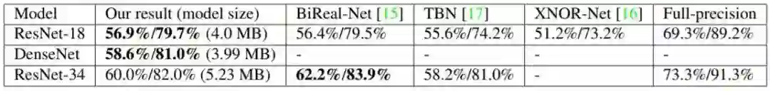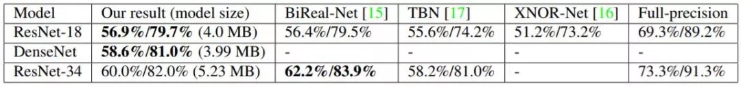 表 7:在 ImageNet 数据集上,本文方法与当前最优二值模型的对比。所有方法都在下采样部分的卷积层中使用了全精度权重。