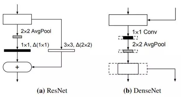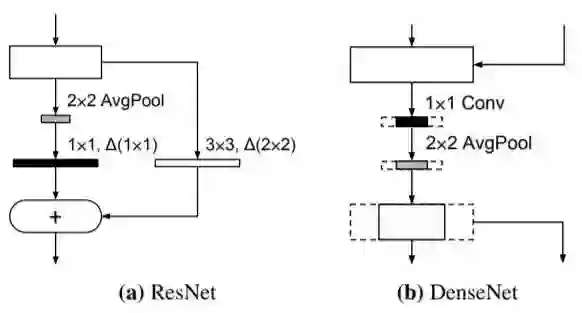 图 3:ResNet 与 DenseNet 的下采样层。加粗黑线表示下采样层,它可被替换为全精度层。如果在 DenseNet 中使用全精度下采样层,则需要加大减少通道数量的缩减率(虚线表示没有减少的通道数量)。