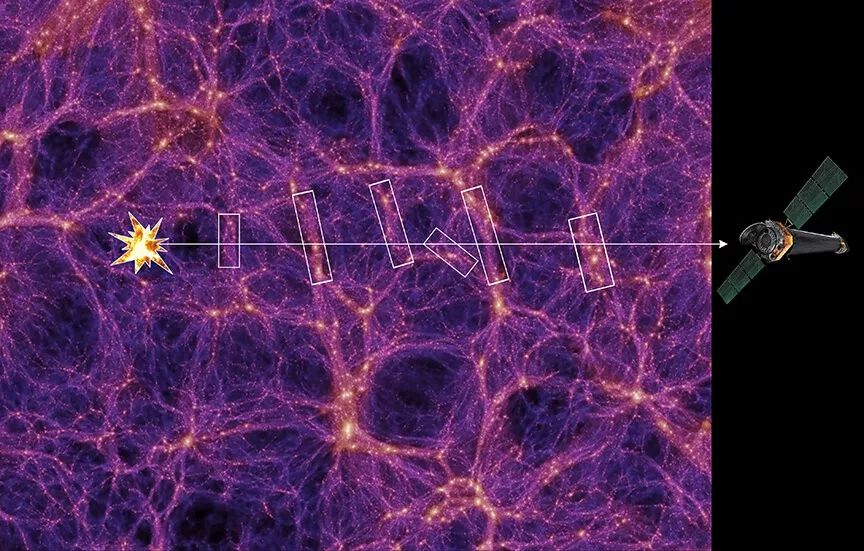 由于宇宙膨胀会拉伸传播中的光,丝状结构在光传播的过程中会向外延伸,因此这些细丝中物质对 X 射线的任何吸收都会向长波长方向进行红移。红移的多少取决于到丝状体的已知距离,因此研究小组可以知道,为了找到星际间介质的吸收光谱,应该在什么位置进行搜索。