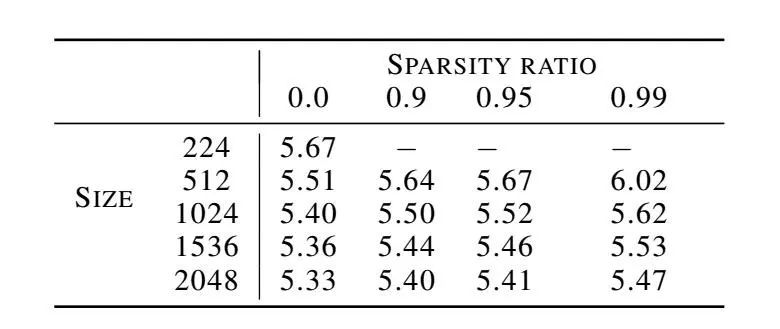 表 6 不同模型尺寸和稀疏程度的稀疏 WaveRNN NLL 分数。