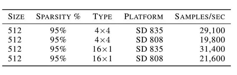 上表是稀疏 WaveRNN 移动采样性能基准实验结果,实现平台为通用骁龙 808 和 835 移动 CPU。模型有 1024 个隐藏单元,95% 稀疏度和 4x4 稀疏结构。