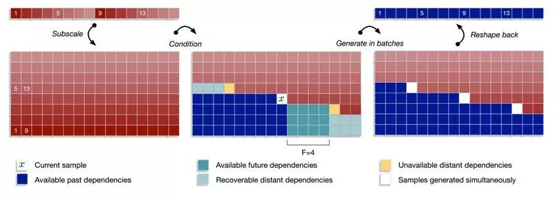 图中每一个方块对应一个 16 位的样本。子尺度方法首先将张量分割成 B 个交错样本的子张量。每个子张量基于之前生成的子张量的过去和未来样本生成。过去范围不受限制,而未来范围为 F,根据条件网络的接受野而定,然后应用批采样。最后的张量由生成的子张量重组而成。
