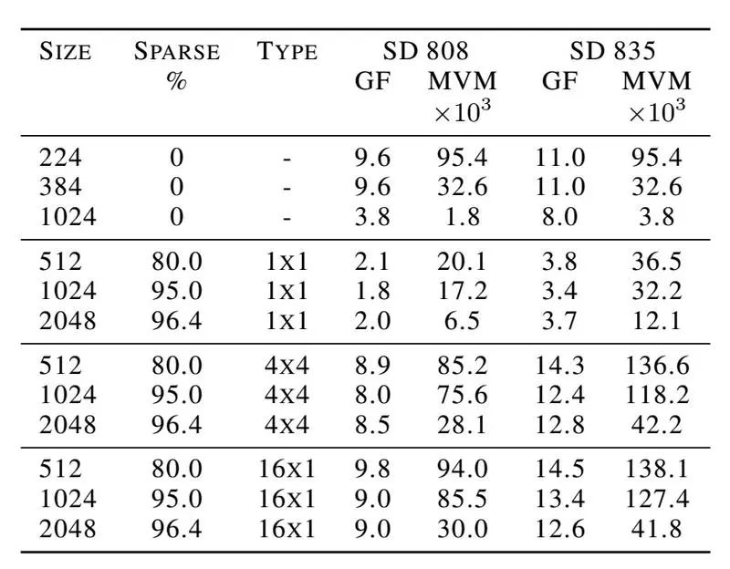 表 7 每秒 ARM 矩阵向量相乘(MVM)和对应的 Gflops,低功耗处理器使用骁龙 808 和 835。