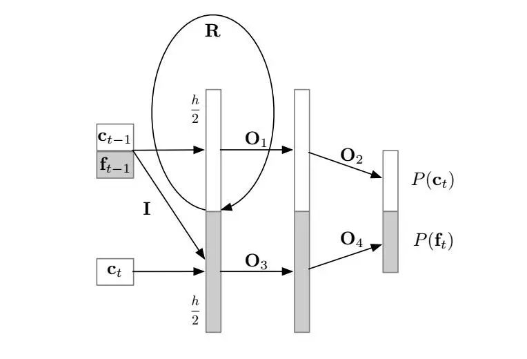 作者将 RNN 的状态分成两部分,c 代表粗(高 8 位)样本,f 代表细(低八位)样本。每一个部分分别输入对应的 softmax 层,对 8 位细样本的预测是基于 8 位粗样本的。R 与粗样本和细样本同时相乘,门输出只用于估算粗样本,然后采样得到 ct。从 P(c) 中采样得到 c 后,估算细样本,然后采样得到 ft。