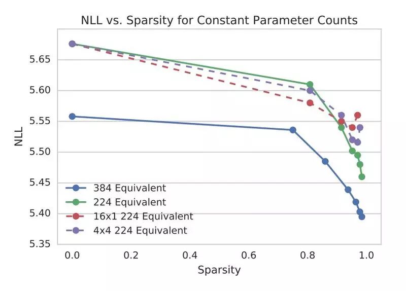 在参数固定时,大型稀疏 WaveRNN 比小型密集 WaveRNN 表现性能要好,而且这一对比关系在稀疏程度高达 96% 时也能保持。