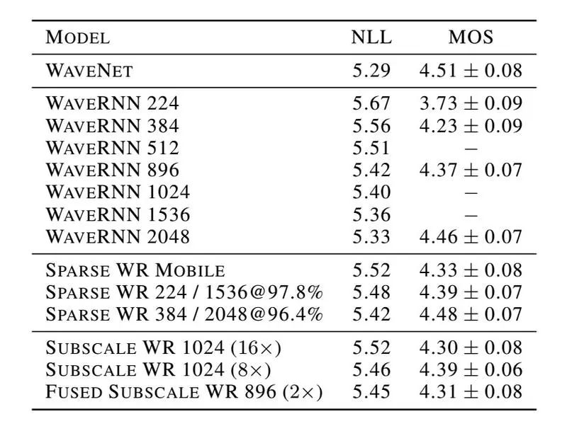 表 4 WaveRNN NLL 和 MOS 在文本转语音基准实验上的评测结果