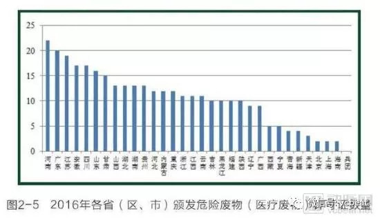截至2016年,全国各省(区、市)共颁发322份危险废物经营许可证用于处置医疗废物(305份为单独处置医疗废物设施,27份为同时利用处置危险废物和医疗废物设施)。2016年,全国医疗废物持证单位实际经营规模为83万吨。