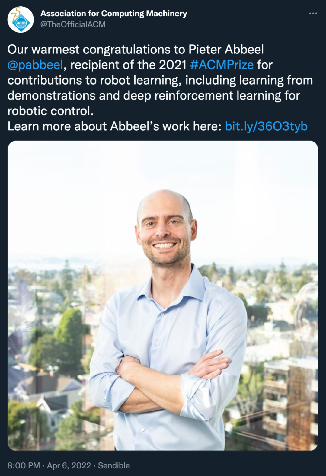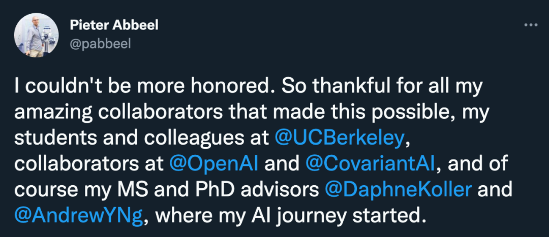 获奖后,Pieter Abbeel 在社交媒体上表示:「我感到无比荣幸。非常感谢所有让这一切成为可能的合作者,感谢我的学生、同事、硕士及博士阶段的导师。」