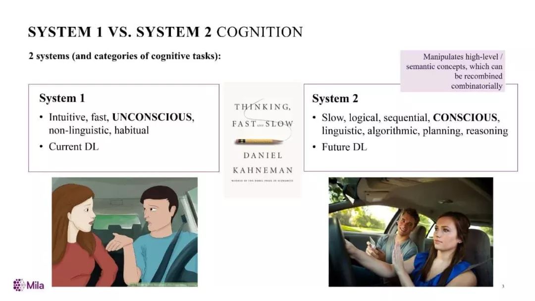 Bengio首先介绍了深度学习的发展困境。他引用了Daniel Kahneman的认知系统理论。