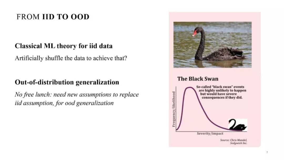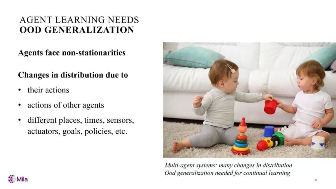 目前深度学习都是基于独立同分布的假设,但实际现状是,我们感兴趣的往往是出现次数非常少的数据。因此,Bengio认为,分布外泛化(out-of-distribution generalization)是目前深度学习所欠缺的,而且是向“系统2”推进的关键。