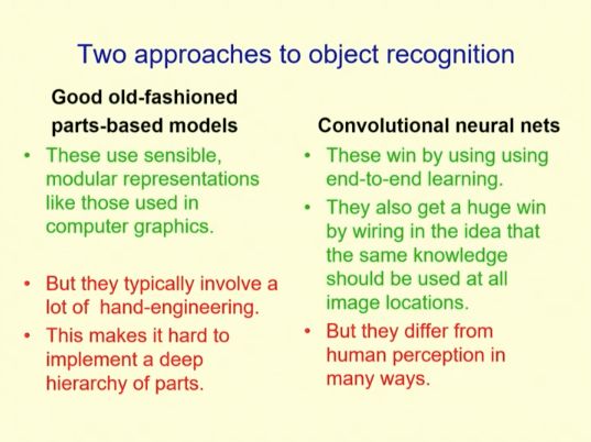 Hinton首先介绍了识别物体的两种方法的优劣势:
