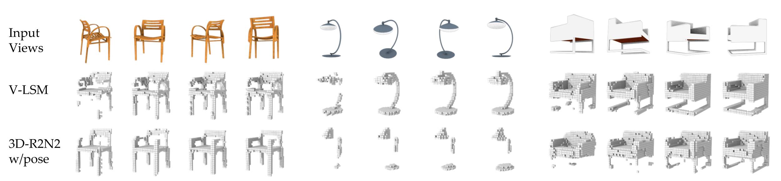 在 UC Berkeley 的论文中,研究者们展示了超越此前业内最佳的(使用循环神经网络)整合多视角构建 3D 模型的方法。此外,研究人员还展示了类别外的概括能力,如 LSM 可以重建汽车的模型——即使它只得到了飞机与椅子图像的训练。唯一的可能解释就是系统是针对任务进行几何处理的。研究人员还从一些视图中获得了细致的模型重建效果——系统对于图片数量的要求显著少于传统 MVS 系统。