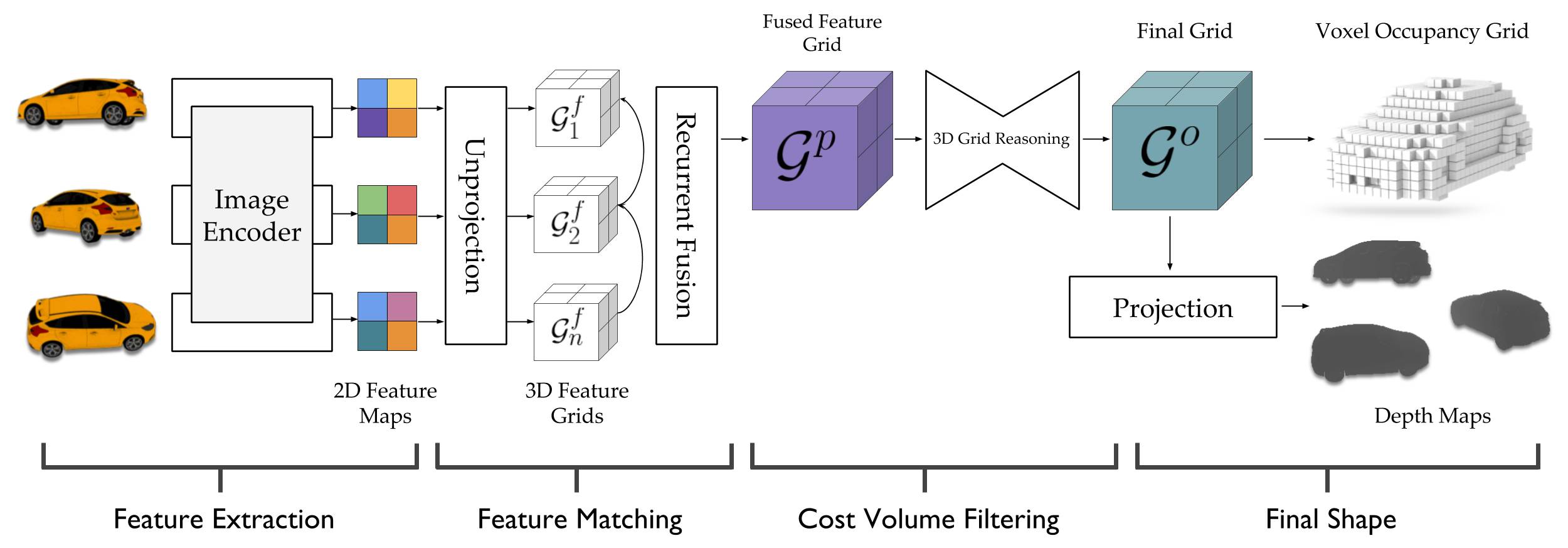 这种特征匹配使用 3D 循环单元建模,该单元在保持匹配分数的运行估计时执行反投影网格的顺序匹配。一旦我们使用了 3D CNN 过滤局部匹配成本体积(local matching cost volume),我们就可以将其直接解码为 3D 网格为立体网格预测任务,或者使用可微分投影操作将其投影回 2D 图像空间。投影操作可以被视为反投影的逆过程,在这里 3D 特征网格与样本特征随着视线将它们以相同深度间隔投影到 2D 特征图上。这种投影特征图随后被解码为每个视图的深度图。在该网络中,所有步骤都是完全可分的,我们可以在此之上训练有监督的端到端深度图或立体网格系统。