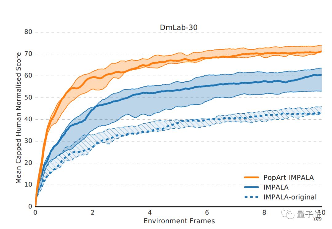 最后,研究人员将PopArt应用于Importance-weighted Actor-Learner Architecture (IMPALA)中,这是DeepMind此前提出的、最常用的深度强化学习智能体。