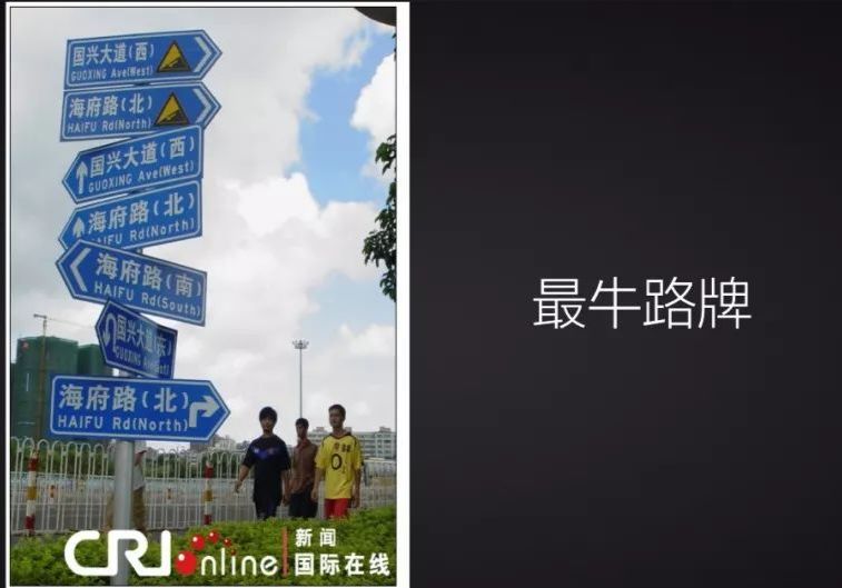海南,2012年,7块路牌并排放在一起,角度差不多,而且有一些相同的信息指的方向完全相反,最牛路牌。