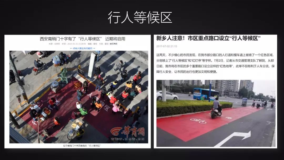 从2015年开始,我关注到这样一项举措——行人等候区,这很大程度上是为了应对中国式过马路的问题。行人等候区已经在很多城市都得到了推广,但是我发现一个非常有趣的问题,绝大多数城市的行人等候区是这种鲜红的红色。