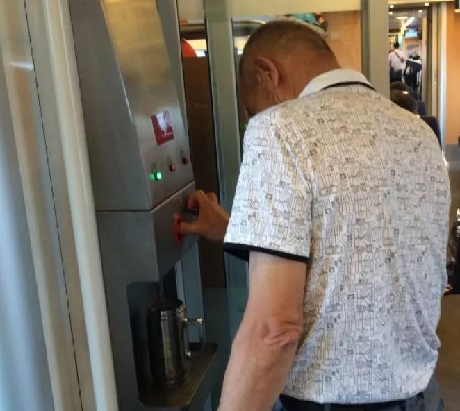 有一次我在高铁上看到我前面的一位大叔要取热水,他拿着空杯子走到热水器那边。过了一会,他又拿着空杯子回来了。