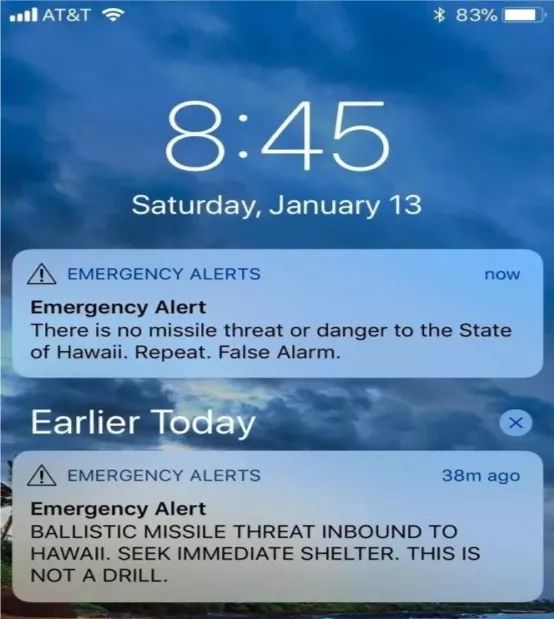 类似这样问题在今年再次上演。今年1月份,夏威夷的居民在早上八点钟,手机突然收到一个警报:导弹来袭,请你赶紧寻找庇护所,而且这不是演习。夏威夷人觉得世界观都要改变了,感觉世界末日要来了。