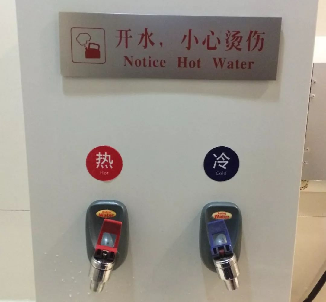 我出差乘飞机的时候经常要用饮水机,我一般第一次都搞不定,因为除了温水键和热水键之外,还有再沸腾键、童锁键等等等等,逼得我不得不去学习它。像这个饮水机它的学习放在哪呢?放在饮水机口的下边。
